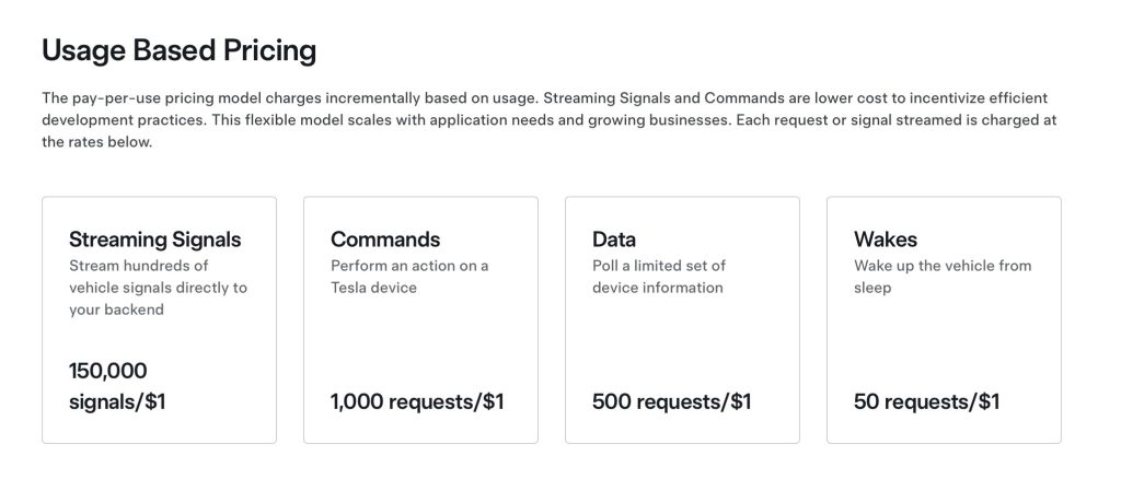 That changed on Wednesday, when Tesla updated their website with the official usage-based API pricing. The rates range from 150,000 streaming signals for $1, to $1 for 50 requests to wake up the vehicle from sleep.