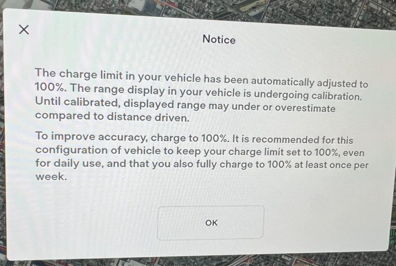 “The charge limit in your vehicle has been automatically adjusted to 100%. The range display in your vehicle is undergoing calibration. Until calibrated, displayed range my under or overestimate compared to distance driven.