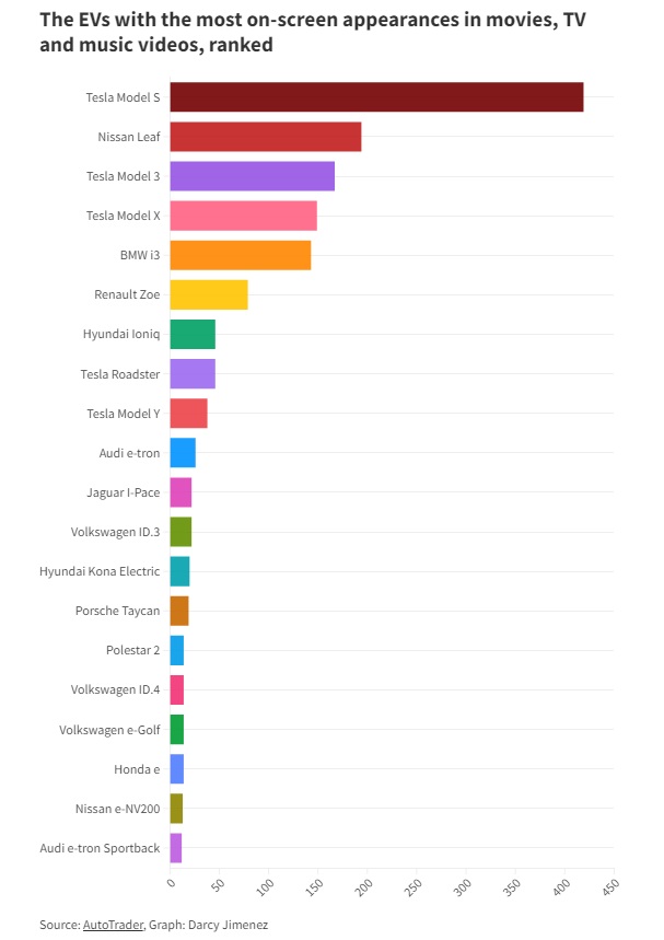 The data comes from a study conducted by the UK’s Auto Trader, revealing that Tesla cars are Hollywood’s favorite electric car. Auto Trader has compiled a list of more than 100 of the most popular electric vehicle models worldwide and cross-referenced it with on-screen appearance data from the Internet Movie Car Database, according to digg. The cars were then ranked according to the number of listed appearances. This data is accurate as of January 2024.