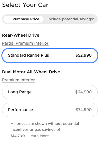 The Standard Range Plus has dropped from $55,990 to $52,990, the Long Range has dropped $67,990 to $64,990, and the Performance Model 3 has dropped from $77,990 to $74,990.