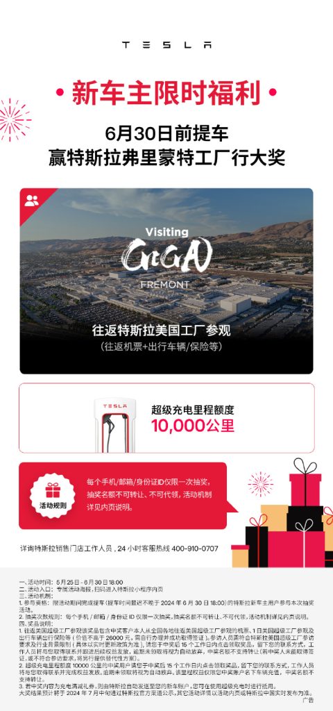 The campaign, announced on Weibo, will take place until June 30, giving Chinese customers who finalize their Tesla vehicle purchases an automatic entry into a draw to win a factory tour in Fremont, California. The lucky winners will be provided with round-trip airfare and transportation costs, allowing them to experience Tesla’s California production facilities firsthand.