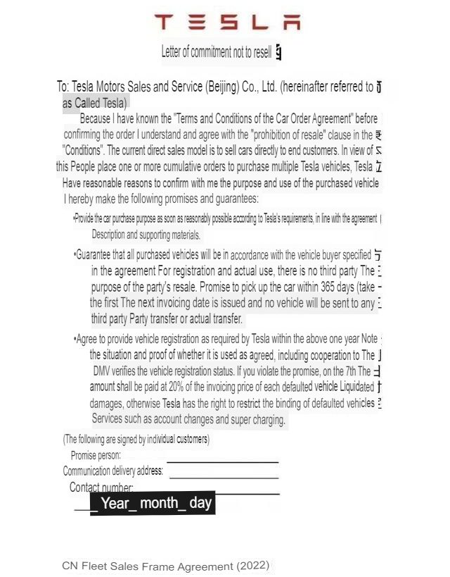 If a customer buys more than one Tesla vehicle in China, they are now required to sign a contract promising not to sell the vehicles within one year of the date of purchase.