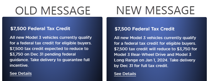 “All new Model 3 vehicles currently qualify for a federal tax credit for eligible buyers. $7,500 tax credit will reduce to $3,750 for Model 3 Rear-Wheel Drive and Model 3 Long Range on Jan 1, 2024. Take delivery by Dec 31 for full tax credit,” Tesla says on the configurator.