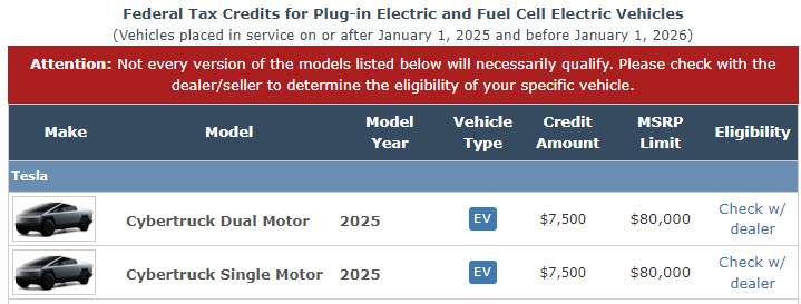 While the federal government has updated their website to indicate the Cybertruck’s eligiblity for the incentive, Tesla does not yet include the point-of-sale deduction on their online configurator.