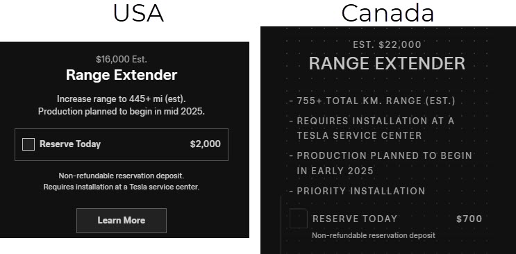 Interestingly, the updated timeline and range figure is only on the US version of the website. The Canadian version still says production will begin in early 2025, and that it will still offer 755+ total km of range. We assume Tesla has just forgotten to update the Canadian configurator, and we won’t be getting a better version of the Range Extender, and earlier, than in the US.