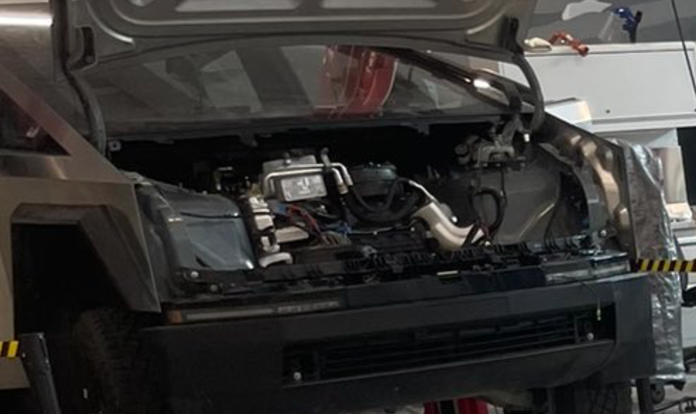 While the unique wrap catches your eye, there is another piece of information revealed in the photo, and that’s the open frunks on both Cybertrucks. We have seen photos of the Cybertruck frunk before, but they were from a distance and not from the correct angle for us to get a sense of how big it is. While the frunk in this is clearly missing the liner, but based on what we can see, there is a lot of equipment in the area making it seem like the frunk will be quite small.