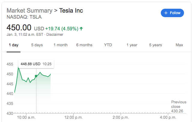 Tesla stock (TSLA) rose early on the record numbers from Tesla, up 5% and reaching a new high of $450 in the first few hours after trading began.