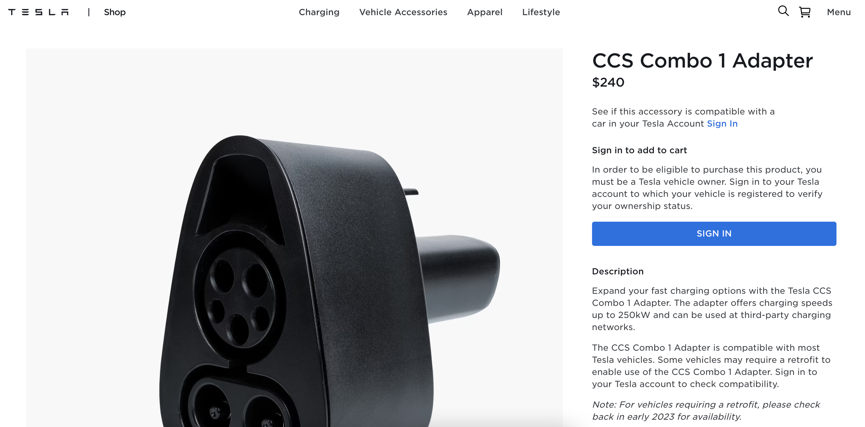 According to an update to the Tesla Shop on Friday the adapter has dropped from its original price of $340 CAD or $250 USD down to $240 CAD or $175 USD, a 30% reduction.