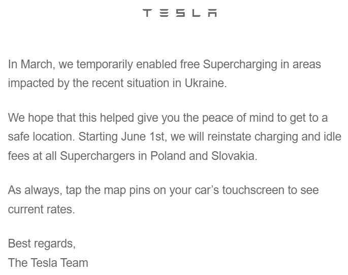 In early March Tesla decided not to bill owners plugging into any of the nine Superchargers in Poland or four in Slovakia to allow them to travel to a safer location if they were in an area impacted by the Russia-Ukraine conflict.