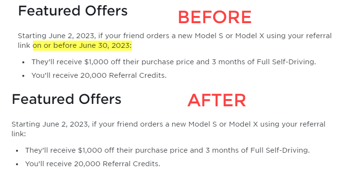 Previously a Model S/X purchase would get both the referrer and the buyer 3,500 credits. Starting on June 2 however only the referrer would earn credits, with the amount increasing substantially to 20,000. While the buyer would no longer receive credits, they would instead receive C$1,300/US$1,000 off their purchase price, plus a three month trial of FSD.