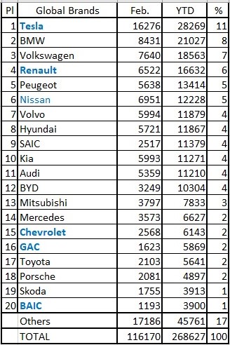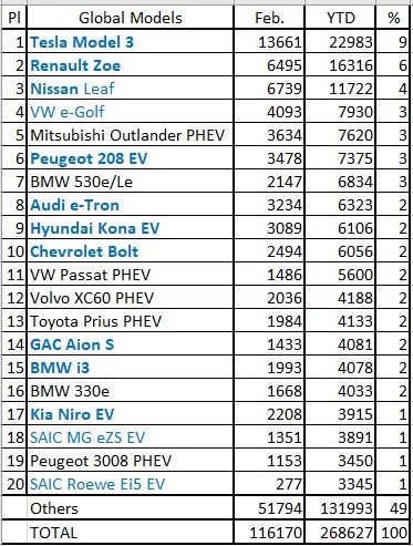 The Nissan Leaf was the second most popular EV in the month of February, with 6,739 units sold in February. The Renault Zoe was in a close third, with 6,495 sales, enough to put the automaker into second place for year to date sales (16,316) behind Tesla.