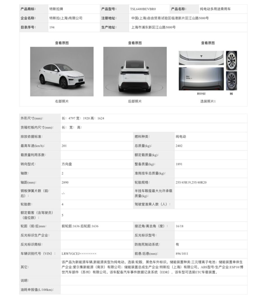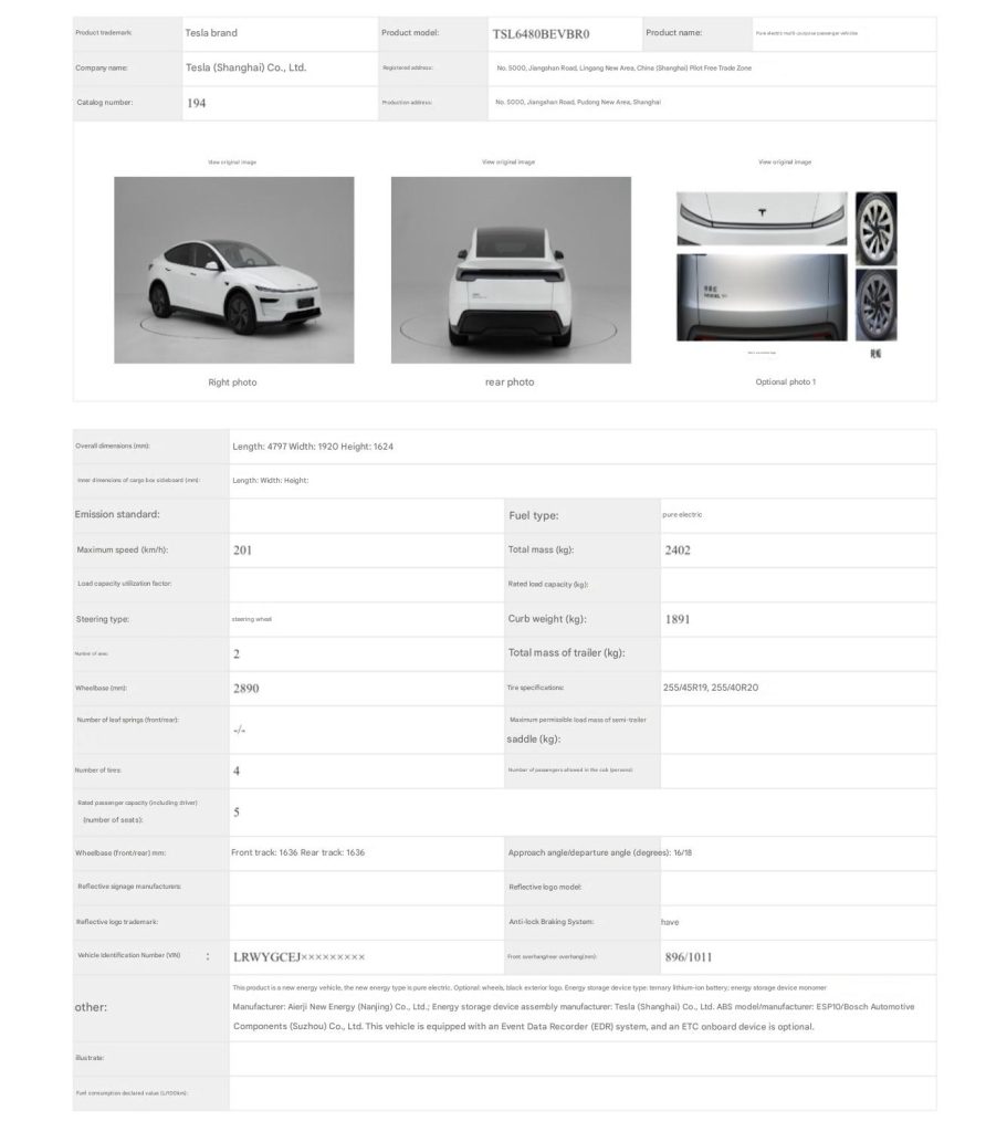 According to a filing submitted to China’s Ministry of Industry and Information Technology (MIIT) this week, the new Model Y+ carries the model code TSL6480BEVBR0 and maintains the same exterior dimensions as the existing five-seat Model Y. It measures 4,797 mm in length, 1,920 mm in width, 1,624 mm in height, and features a 2,890 mm wheelbase.