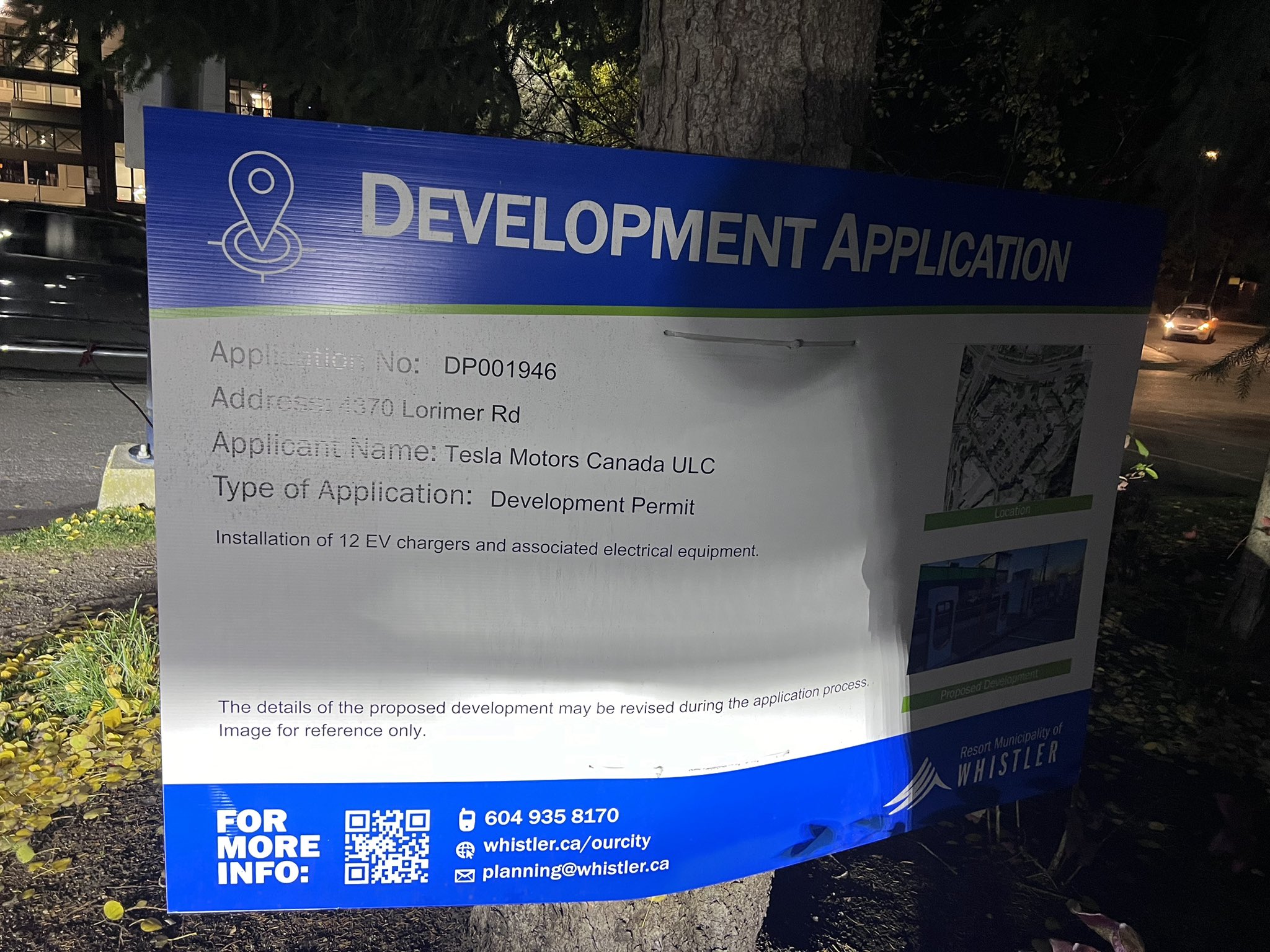 Tesla has since been able to resolve whatever issues there were with the plans, and their application is now in the review stage. This week a sign went up in the parking of Whistler’s Marketplace Shopping Centre notifying residents of Tesla’s intentions to build a 12 stall Supercharger located adjacent to the motorcycle parking area. Thanks to our reader Dwayne for venturing out to the site to grab the photo for us.