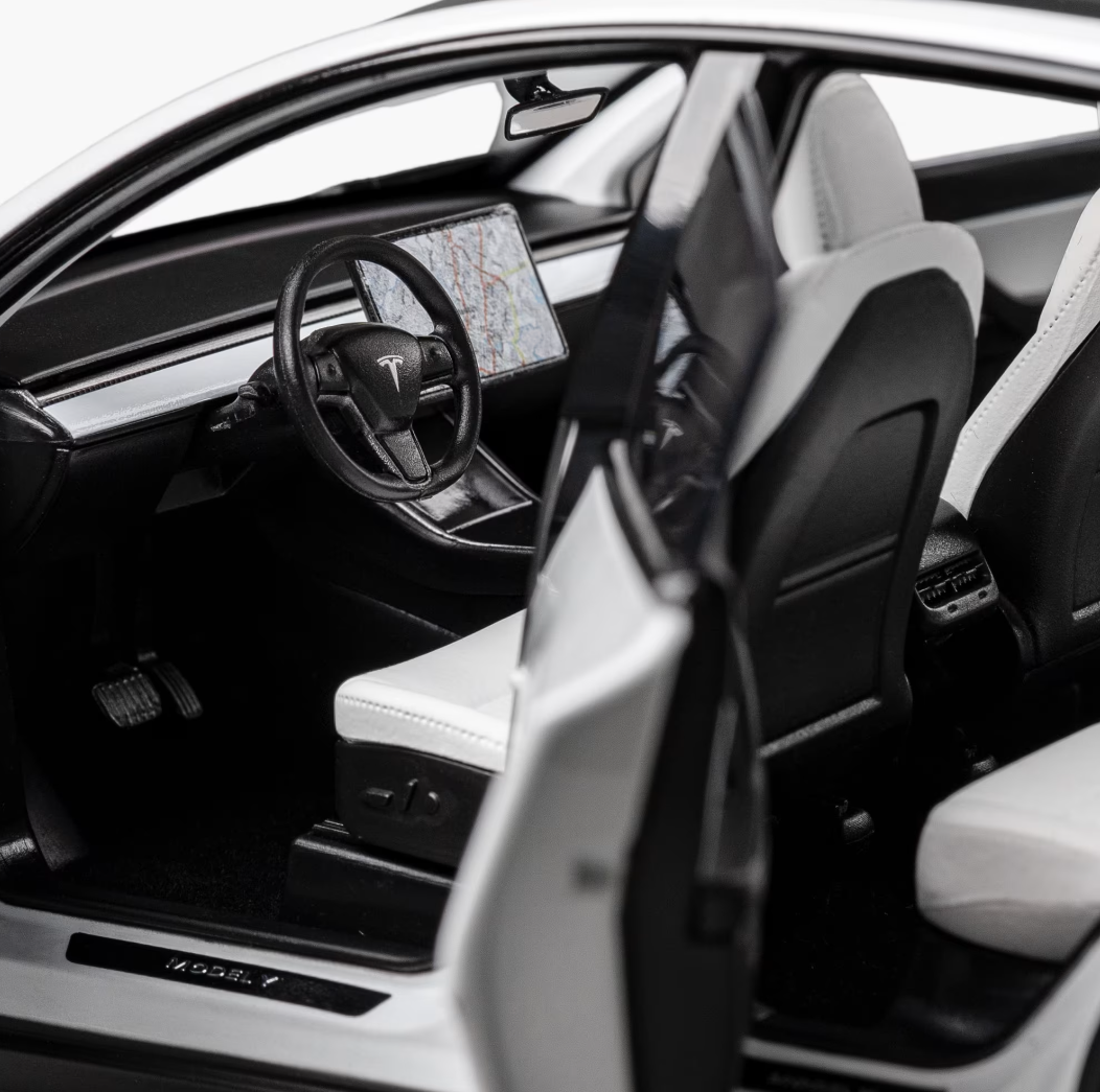 The 1:18 scale Model Y diecast has over 180 metal and plastic parts. The level of detail even carries through to the interior that features fabric seat belts with buckle details, carpeted trunk and interior, and even a panoramic glass roof. Even the doors, front trunk, and rear liftgate can be opened and closed, and the rubber tires and steerable wheels ensure a smooth and realistic rolling experience.