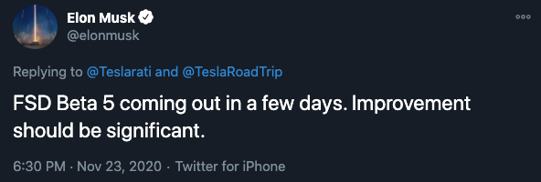 That hard work has resulted in four over-the-air (OTA) updates to the FSD software. Now a fifth version is ready to be released, which according to CEO Elon Musk will happen “in a few days.”