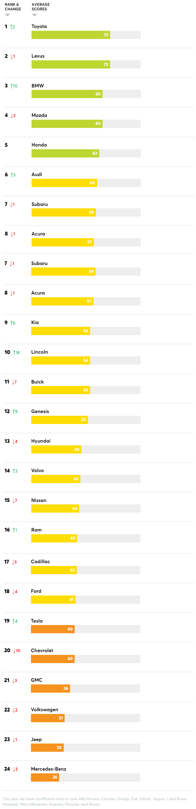 Of the 24 brands ranked in the survey, Tesla landed in 19th spot overall with a score of 40. This was a 4 spot improvement over last year.