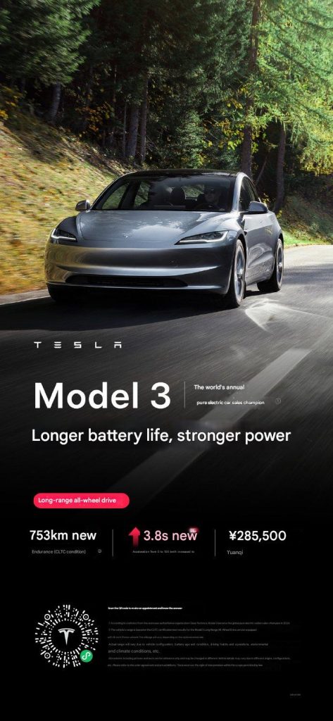 Other Model 3 variants remain unchanged. The entry-level Rear-Wheel Drive (RWD) version still starts at RMB 235,500 (C$44,700/US$32,800), and the performance version remains priced at RMB 339,500 (C$64,500/US$47,300), with wait times of 1–3 weeks and 8–10 weeks, respectively.