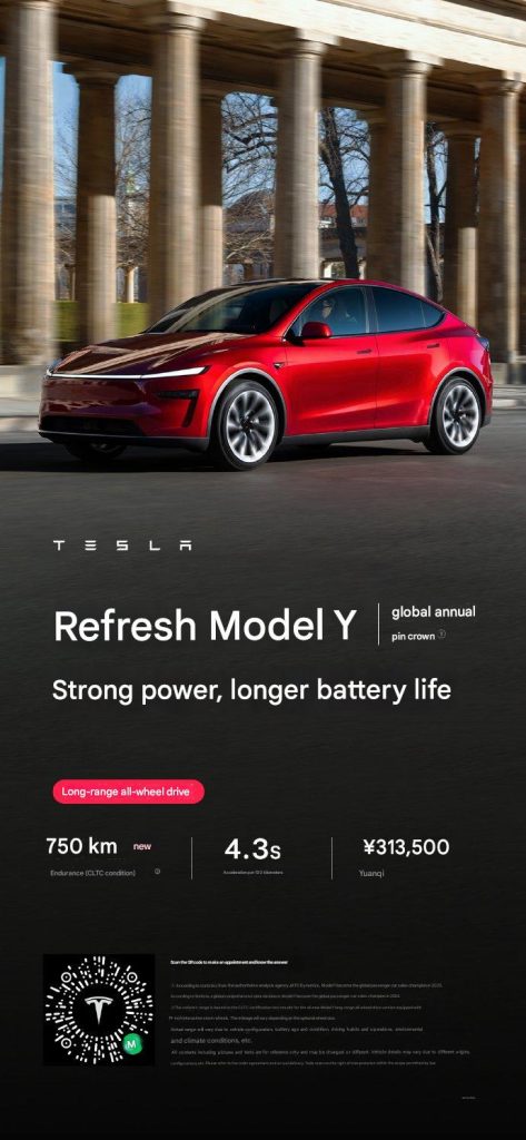 The Model Y Long Range has also been upgraded, with its CLTC range improving from 719 km to 750 km (446 to 466 miles), while its acceleration time holds steady at 4.3 seconds. Despite the enhancements, the price of the Model Y Long Range remains unchanged at RMB 313,500 (C$59,500/US$43,750). Delivery wait times have shortened to 1–3 weeks.