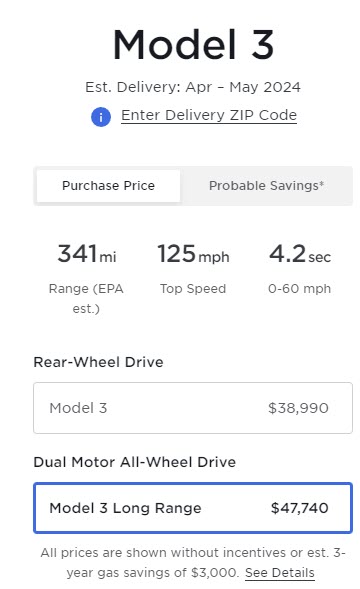 The price of the Model 3 Rear-Wheel Drive (RWD) is unchanged at $38,990, and its delivery window is also still the same at between February and March.
