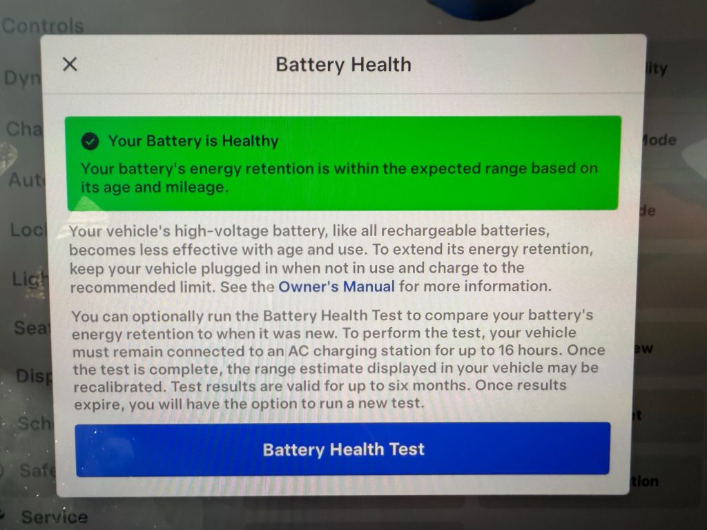 - You can now run a Battery Health Test to measure your battery’s energy retention compared to when it was new. Running this test may recalibrate the energy estimate, which could affect your displayed range. Go to Controls > Service > Battery Health.