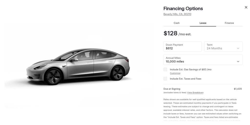 The deals are even better for Model 3, where payments can be around $150 per month with no money down, or just $128 month with the maximum down payment of $612 on this 2018 example.