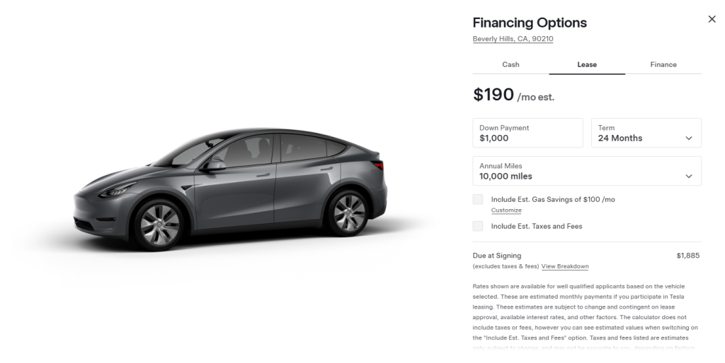 Based on a review of Tesla’s used vehicle listings in California, we were able to find numerous examples of the Model Y available for around $230 per month with $0 down. Add in a small $1,000 down payment, and the payment drops to under $200 per month. This applies to leases for 24 months with an annual mileage limit of 10,000 miles.