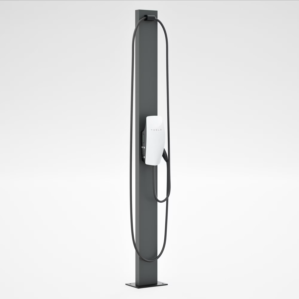 Tesla’s existing “Pedestal for Wall Connector” provides a free-standing solution for situations where a wall mount isn’t practical. However, with that shorter pedestal, the charging cable is typically wrapped around the Wall Connector itself — similar to a traditional wall-mounted setup.