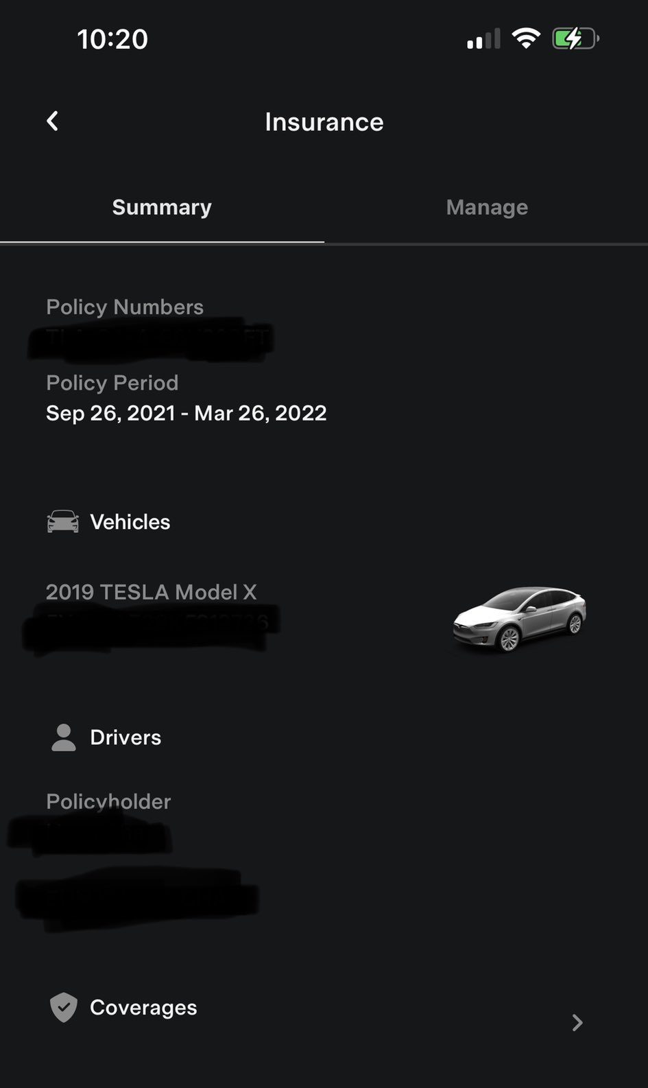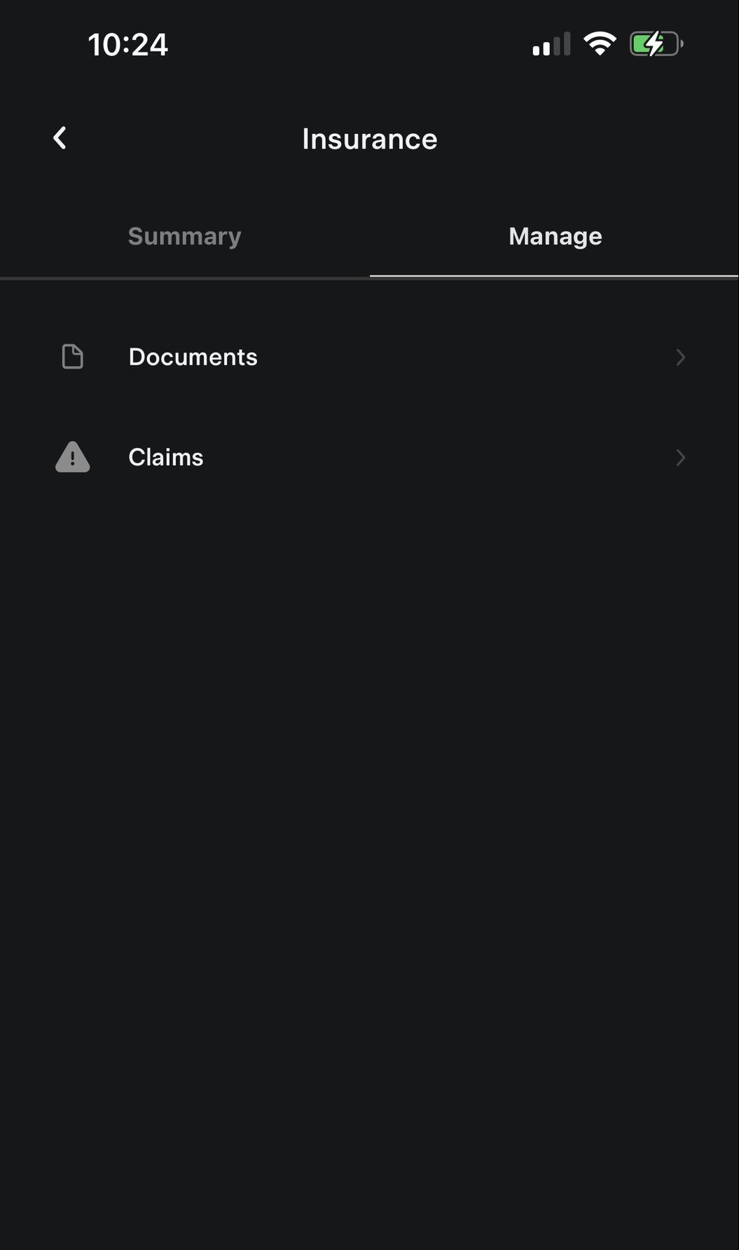 There is also a Manage tab, where you can access your insurance documents and also initiate an insurance claim.