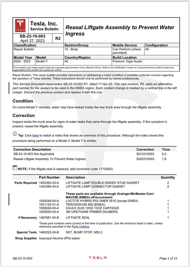 While the instructions for the fix aren’t detailed, Tesla says that technicians should “reseal the liftgate assembly” on affected Model Ys, with the fix taking about 1.8 hours to complete. Based on the list of required parts, Tesla will be replacing the liftgate lamp double-ended stud gaskets and the liftgate lamp connector gaskets, as well as using some loctite hybrid polymer and sealant to prevent further issues.