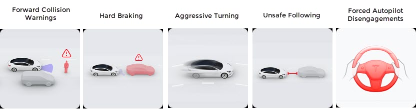 According to the page, the same five factors will be considered in determining your score – Forward Collision Warnings, Hard Braking, Aggressive Turning, Unsafe Following, and Forced Autopilot Disengagements.