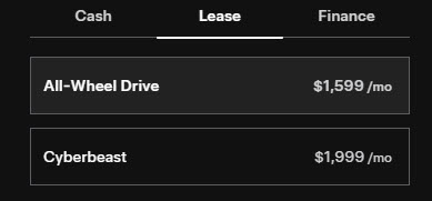 According to Tesla’s online configurator, Cybertruck leasing starts at $1,599/month for the All-Wheel Drive (AWD) Cybertruck, or $1,999 for the Cyberbeast with $0 down for a 48-month term and an annual driving limit of 16,000km.