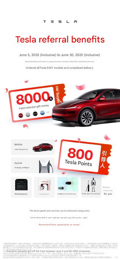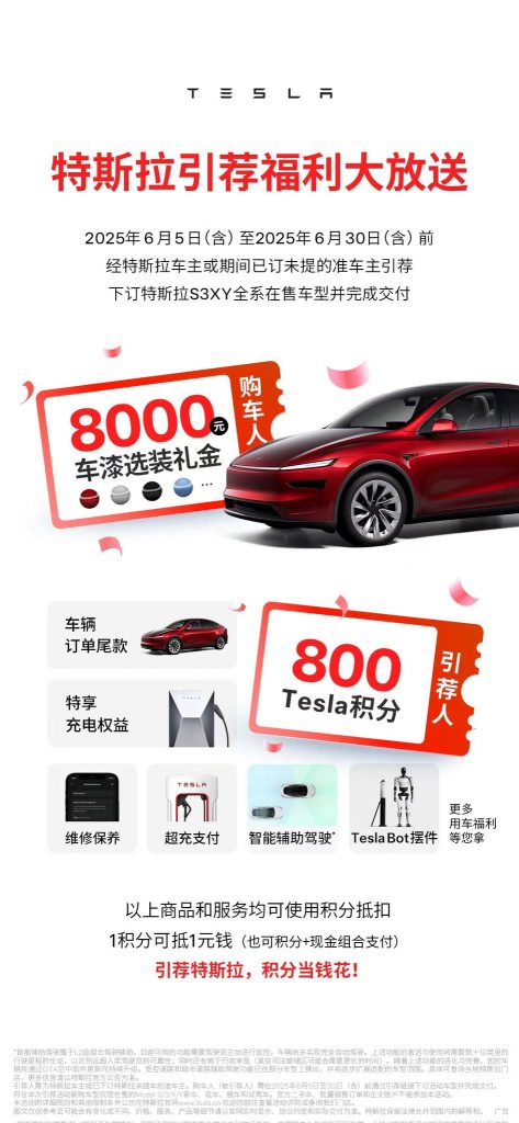 In addition to the referral benefits, Tesla is also promoting its interest-free financing for up to 5 years on select models. Buyers who take delivery by June 30 may also qualify for an ¥8,000 insurance subsidy, adding even more value to the purchase.