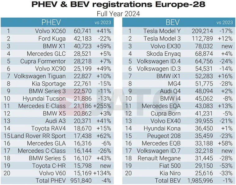 While the Model Y was the best-selling BEV, the Model 3 was able to easily secure a second place showing with nearly 113,000 registrations in 2024 across Europe.