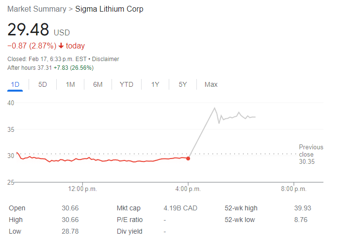 Sigma Lithium (SGML) is listed on the Toronto stock exchange (TSX) and is currently trading at around CAD$40 per share, giving it a market capitalization of CAD$4.2 billion. After news of the potential acquisition emerged, shares surged even higher in after-hours trading, up more than 26%.
