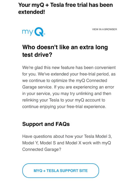 In the email titled “Your myQ + Tesla free trial has been extended!” Chamberlain says the extra time is so that they can “continue to optimize the myQ Connected Garage service.”