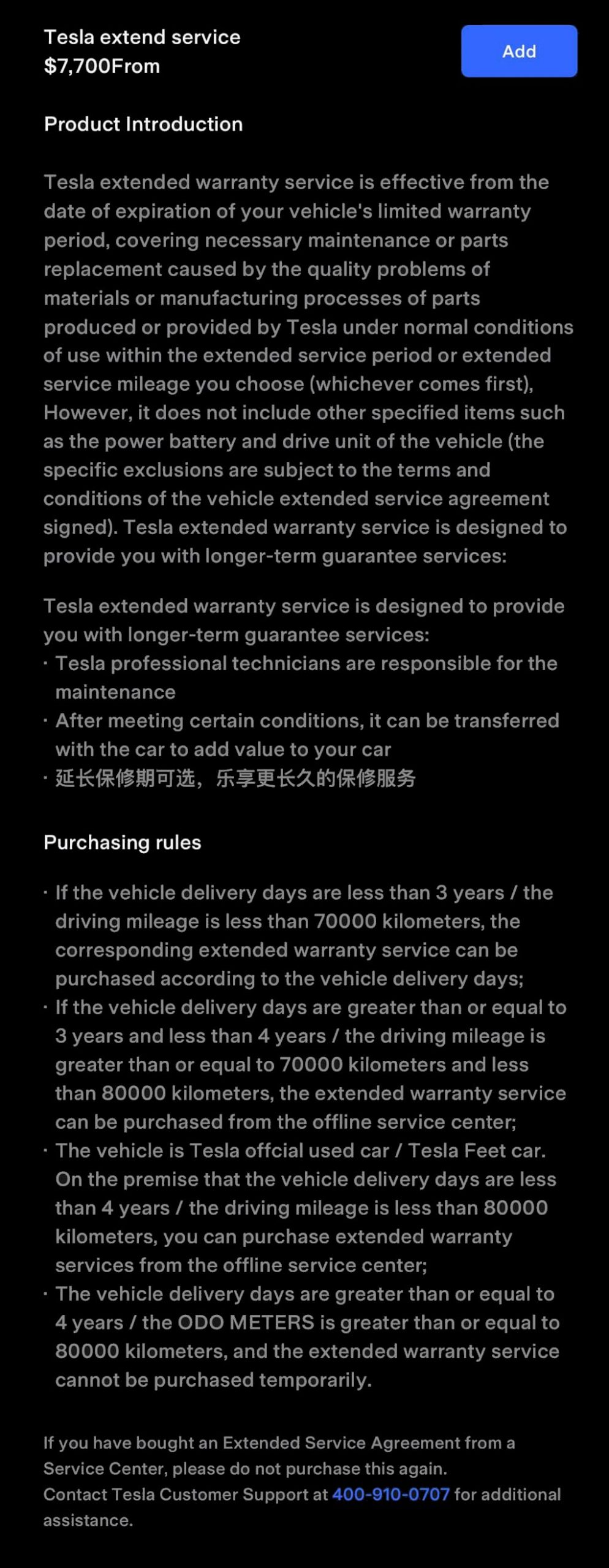 The description also shows there will be some purchasing rules which pertain to how old your Tesla is and how much mileage it has, and whether you can purchase it from within the app or from a Service Center.