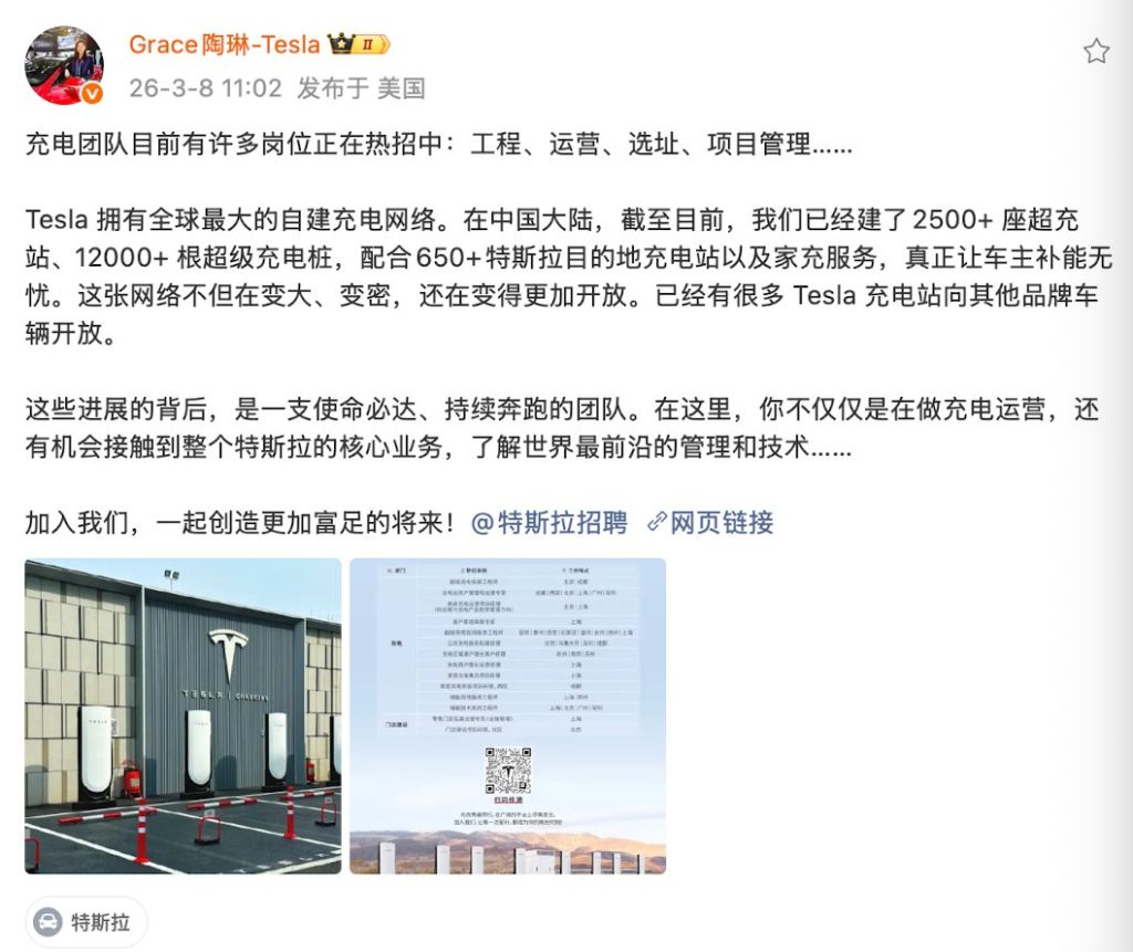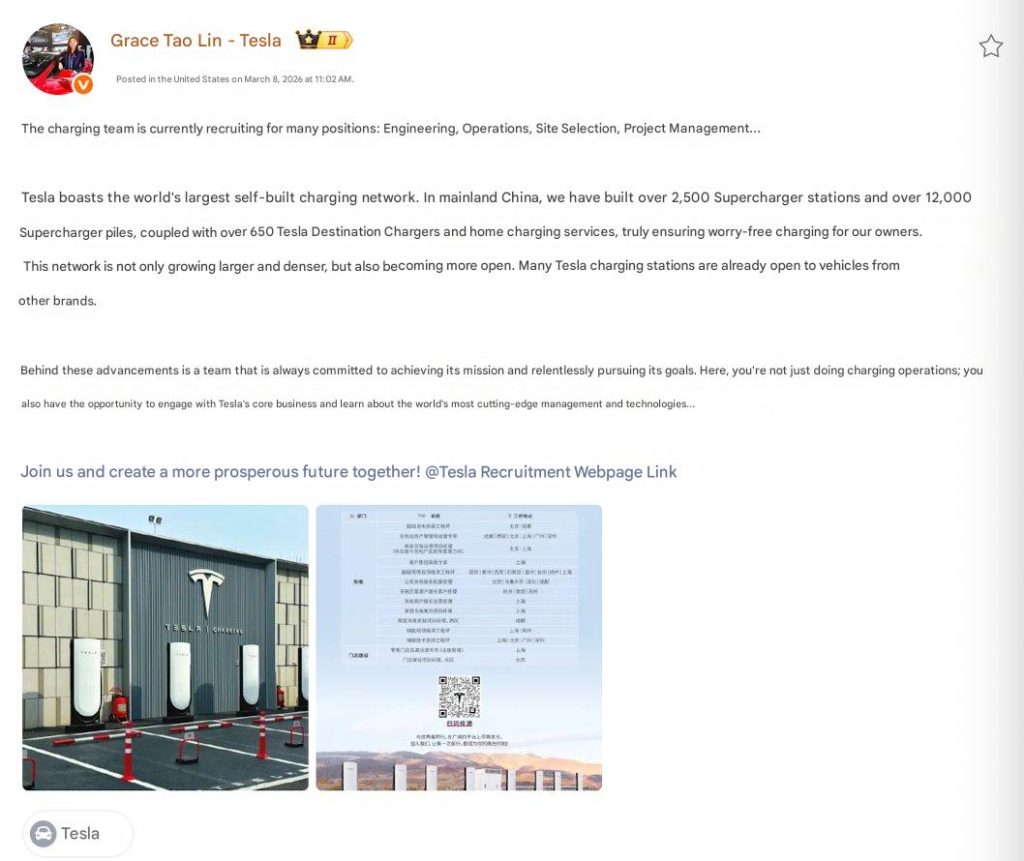 The milestone was shared by Tesla Vice President Grace Tao in a recent post on Weibo, highlighting the continued buildout of the company’s energy ecosystem in the region, while also encouraging people to apply to join Tesla China’s charging team.