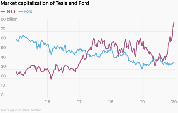 It wasn’t that long ago that Ford Motor Company was valued higher than Tesla. In April 2017, Tesla first overtook Ford in terms of market cap, and just 8 months ago they were valued around the same amount. Now Tesla is valued twice as much as Ford, which has been around for 116 years, which has a market cap of $37 billion.