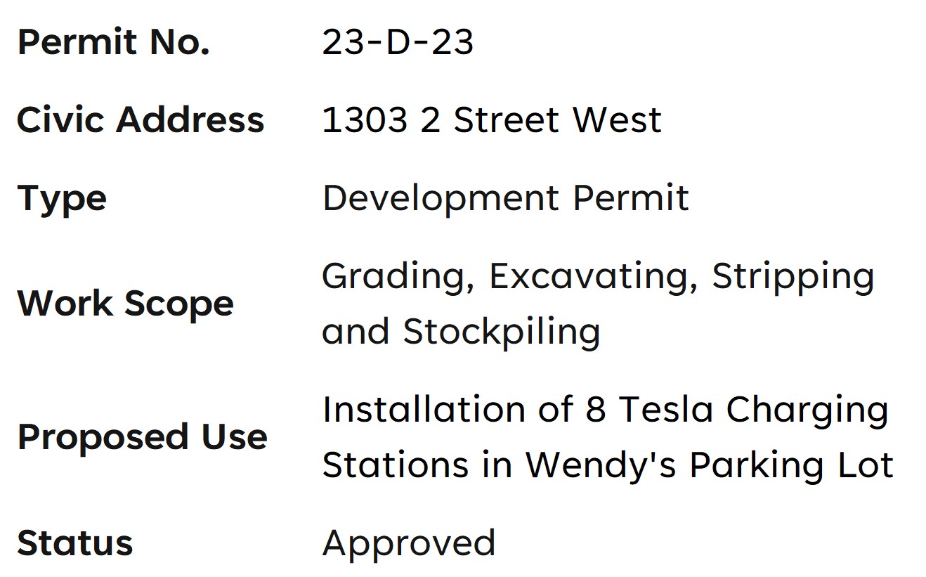Last week, Tesla was granted a permit to build an 8-stall Supercharging station in the Wendy’s parking lot on 2 Street West.