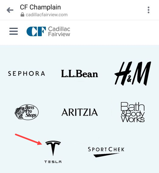 In a recent update to the CF Champlain website, the company highlighted some of the prominent name brands inside the mall, including some that have yet to open, one of which was Tesla. This was apparently a bit of a mistake as the logo has since been removed from the website.