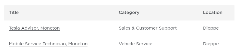While CF accidentally revealed Tesla’s expansion plans, the automaker has also quietly announced its intentions to move into New Brunswick on its Careers website. There are currently two job listings published, one for a Mobile Service Technician, but more importantly a Tesla Advisor in Dieppe, where CF Champlain is located.