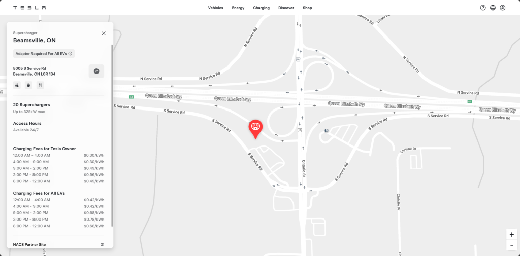 Charging rates at the Ottawa station range between CA$0.29 and CA$0.59 per kWh for Tesla owners, and between $0.40 and $0.82 per kWh for non-Tesla owners, depending on the time of day, with off-peak hours offering the most affordable rates.