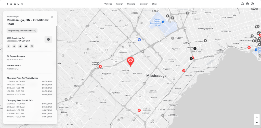 Further west, Tesla has launched a new 24-stall Supercharger site in Mississauga, with V4 charging posts capable of delivering up to 325 kW. This makes it one of the highest-capacity charging hubs in the province, designed to handle significant demand in the Greater Toronto Area.