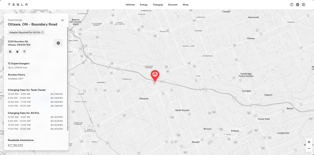 In Ottawa, Tesla has energized a new 12-stall Supercharger located at 5329 Boundary Road. The site supports charging speeds of up to 250 kW.