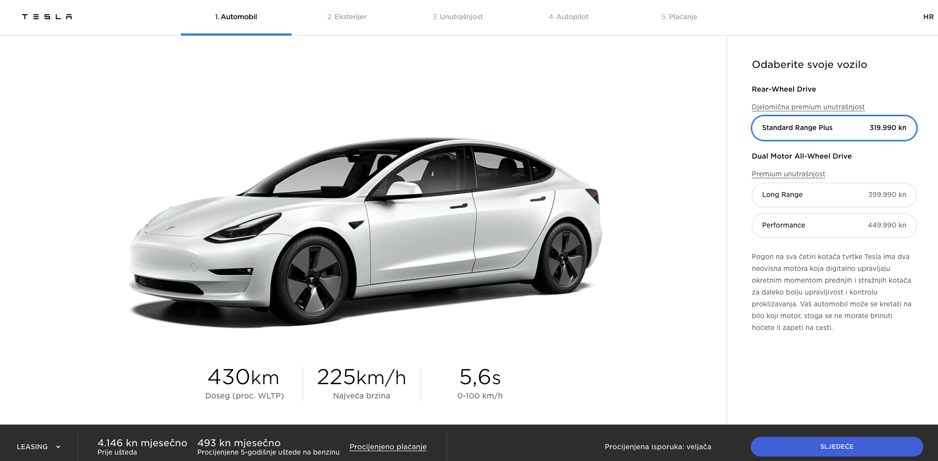 The Standard Range Plus (SR+) Model 3 starts at 319,990 kn ($65,700 CAD). The Long Range starts at 399,990 kn ($82,100 CAD), while the Performance variant starts at 449,990 kn ($92,400 CAD).