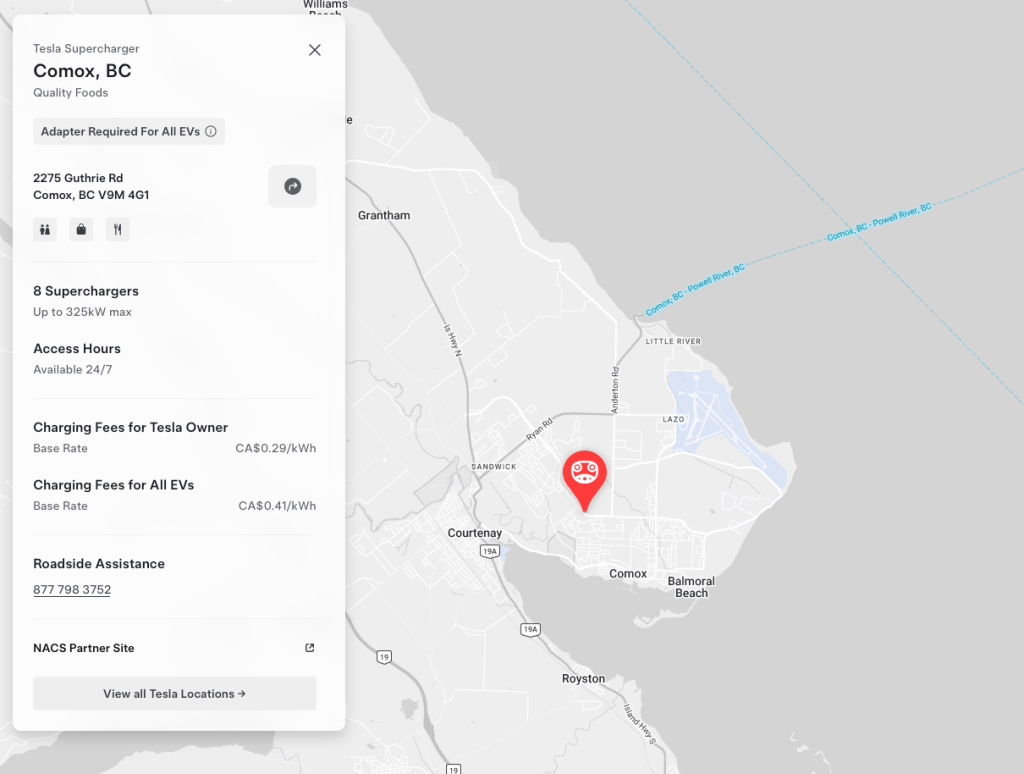 Located at the Quality Foods parking lot at 2275 Guthrie Road, the new station is now live after first appearing on Tesla’s Find Us map in late 2024 and entering construction earlier this year. Its activation represents a meaningful milestone for EV drivers traveling north of Nanaimo, where fast charging options have historically been limited.