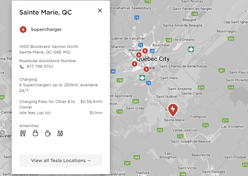 The Sainte Marie Supercharger hasn’t yet appeared on the mobile app, so we don’t know the pricing for Tesla owners. However, Tesla has updated their website, which includes the non-Tesla pricing at $0.58/kWh. Based on Tesla’s pricing strategy for other EVs, Tesla owner pricing should be around $0.45/kWh.
