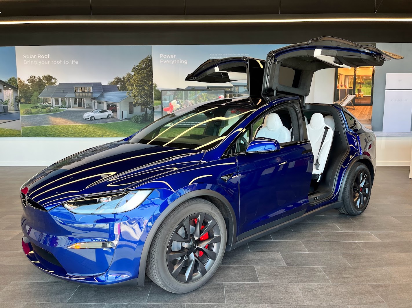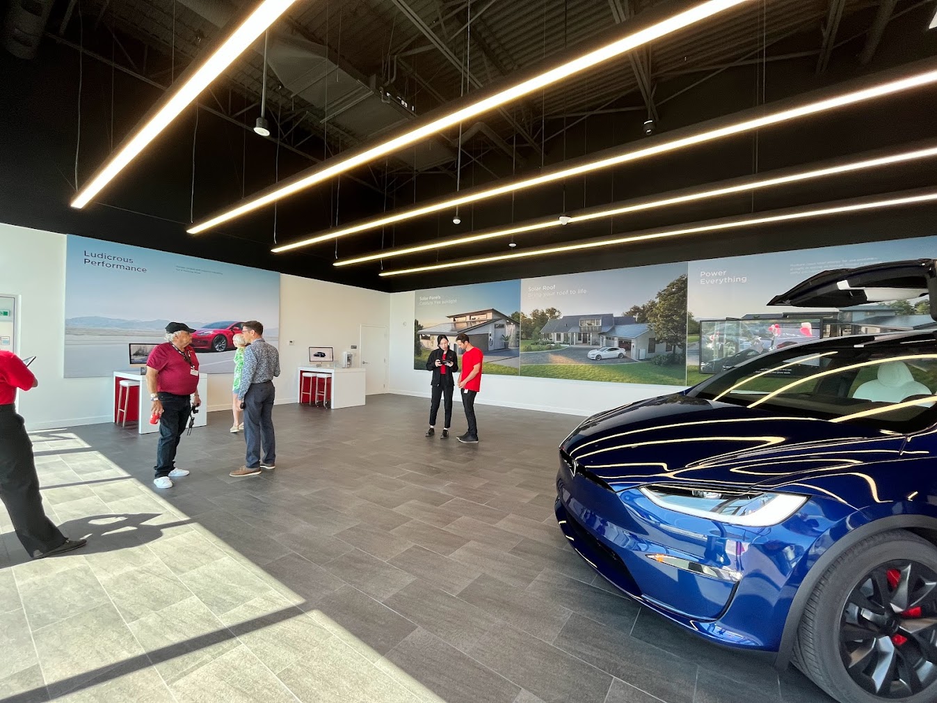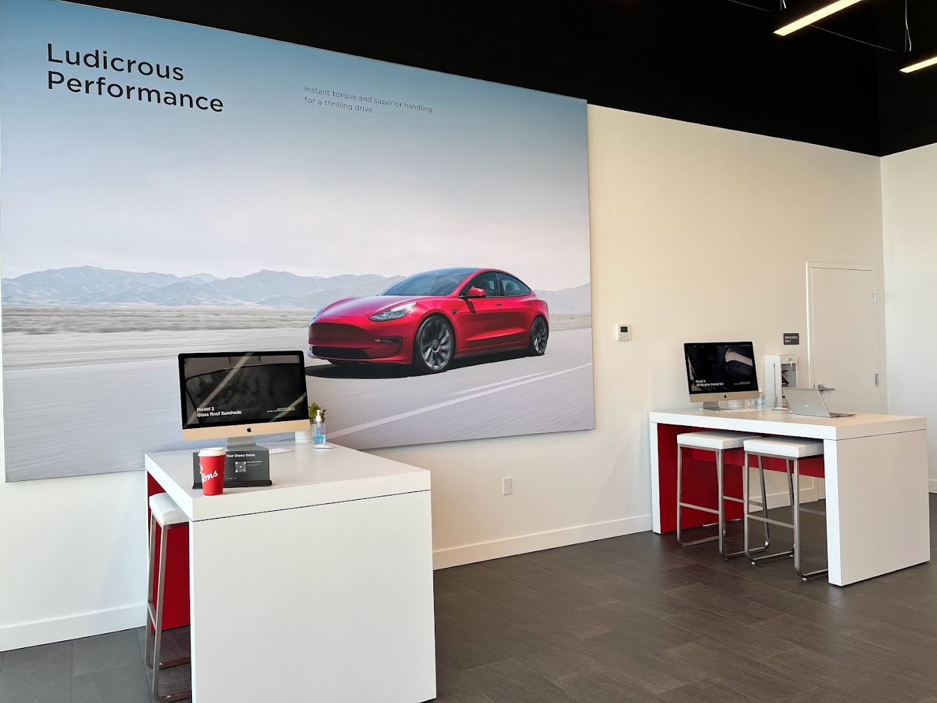 We got a behind the scenes look at the new 35,000 square foot facility. At the front of the building is the showroom, but unlike traditional dealerships, there is only space to display three cars. On opening day there was a Model X Plaid parked inside, with the typical red and white desks nearby where customers can order their cars online. There is also a customer lounge, conference room, offices, and a breakroom for employees.
