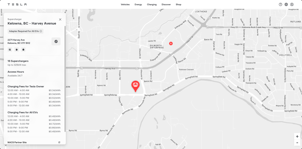 The new Kelowna Supercharger is located along Highway 97 at Orchard Park Mall at 2271 Harvey Avenue. As with the two other Superchargers in the city, this site features tiered pricing, with rates starting as low as $0.34/kWh overnight and early mornings and peak at $0.52/kWh between 10:00 AM and 5:00 PM. Evening pricing from 5:00 PM to 9:00 PM is set at $0.46/kWh, helping to balance demand during peak travel hours.