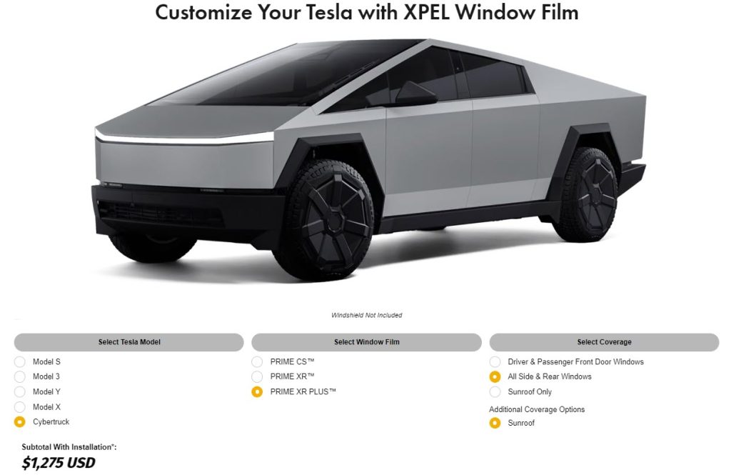 According to a new page on XPEL’s website, the price for Tesla’s window tinting begins at US$150, and go up from there based on how many windows you want tinted. The service is available for all of the Tesla’s vehicles, including the Cybertruck.